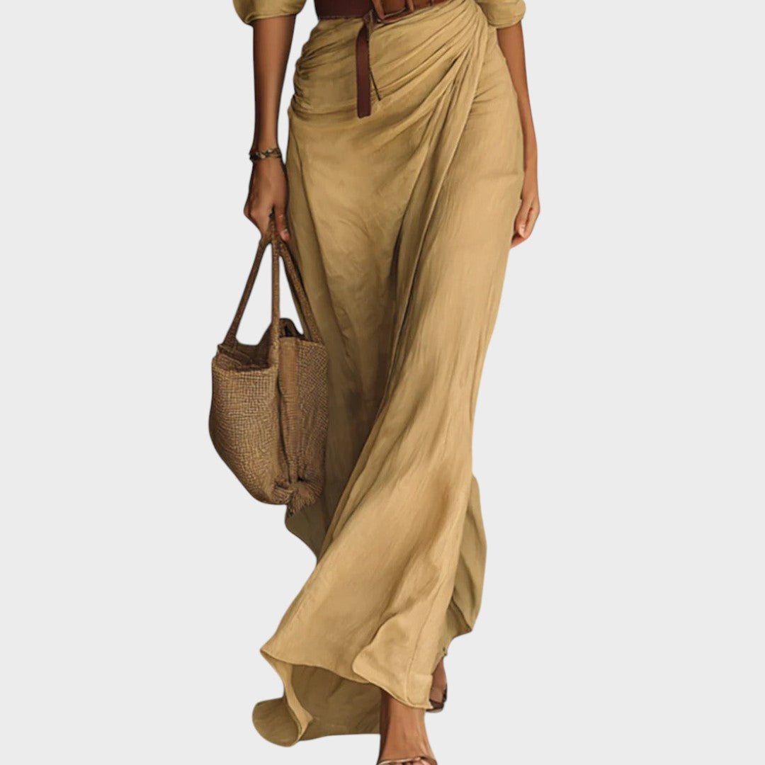 Ova maxi haljina s dugim rukavima spaja sofisticiranost i senzualnost u savršenoj ravnoteži. S elegantnim krojem, naglašenim strukom i lepršavim padom tkanine, naglašava žensku siluetu na bezvremenski način. Višenamjenski komad koji se savršeno uklapa u svečane prigode, ali i u opuštene trenutke, uvijek pružajući upečatljiv i stilski izgled.