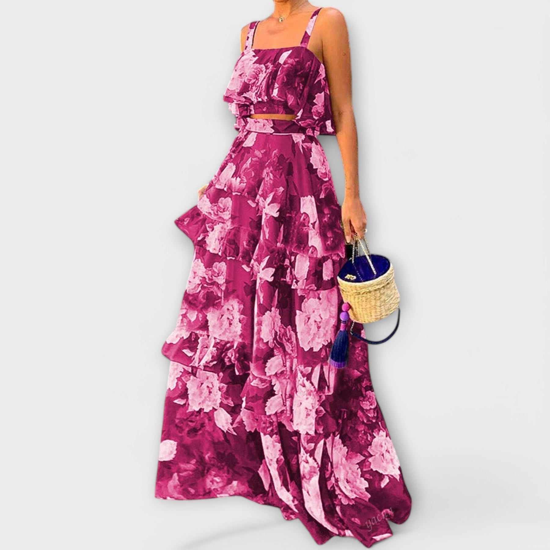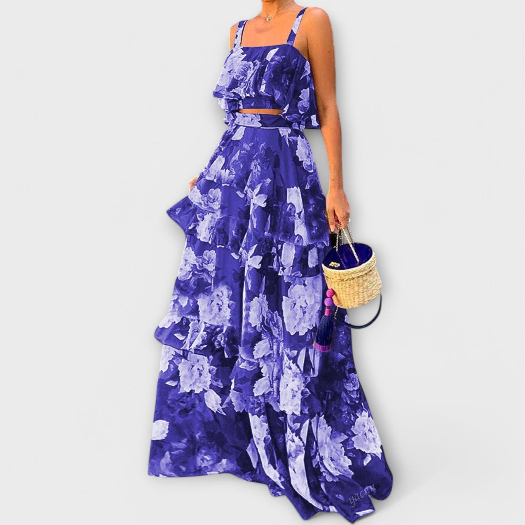 Privucite poglede s ovim dugim cvjetnim setom punim lakoće i sofisticiranosti. Bluza s delikatnim volanima i duga suknja s slojevima stvaraju očaravajući pokret i upečatljivu siluetu. Idealan za zabave, odmore ili elegantne šetnje uz more, spaja romantiku, svježinu i puno osobnosti.