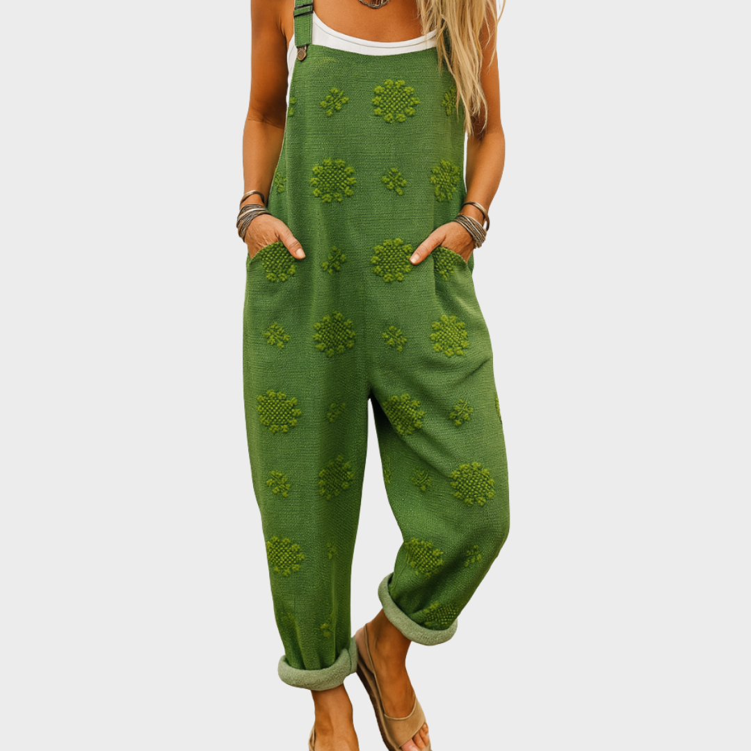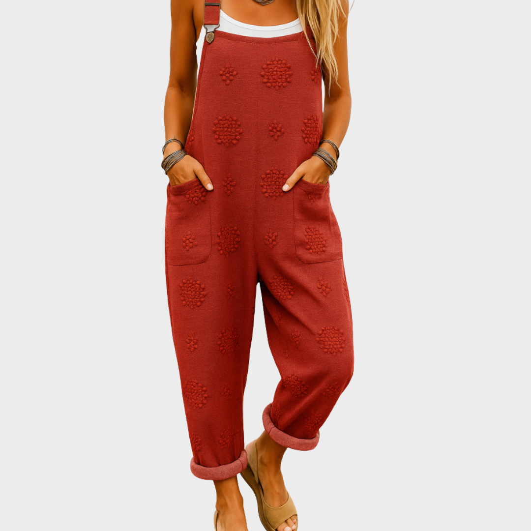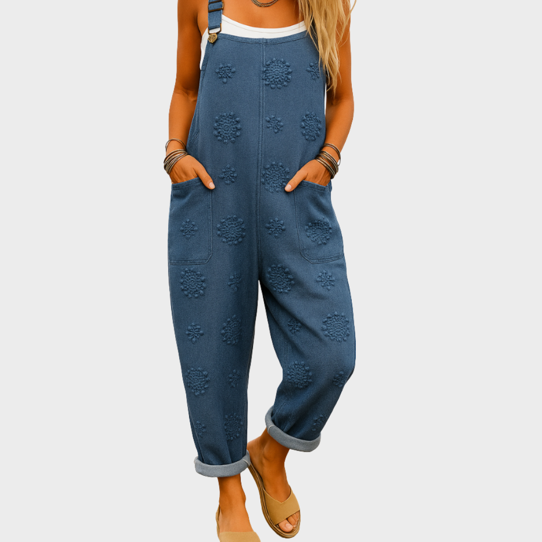 Ovaj udobni kombinezon spaja opušteni kroj s jedinstvenim teksturiranim detaljima koji mu daju poseban šarm. Široke nogavice i podesive naramenice omogućuju slobodu pokreta i prilagodbu, dok praktični džepovi dodaju funkcionalnost. Idealan je za svakodnevne aktivnosti, izlete ili opuštene vikende.
